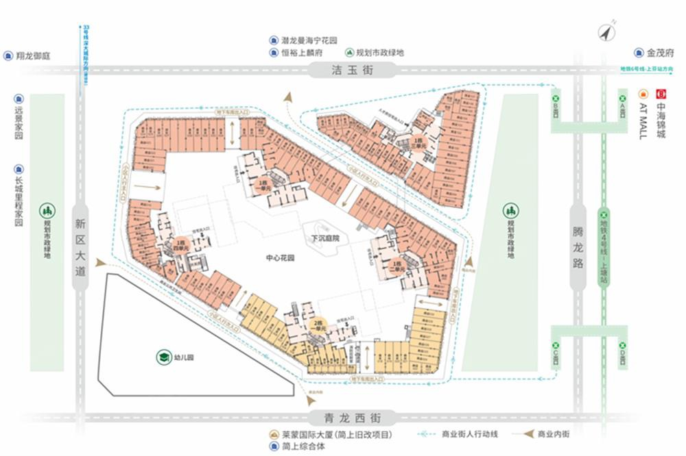 項目緊鄰街心公園、市政公園,四周環布交通干道,與周邊龍華文體中心、簡上體育綜合體等“四館一城”共同打造沉浸式步行街區;